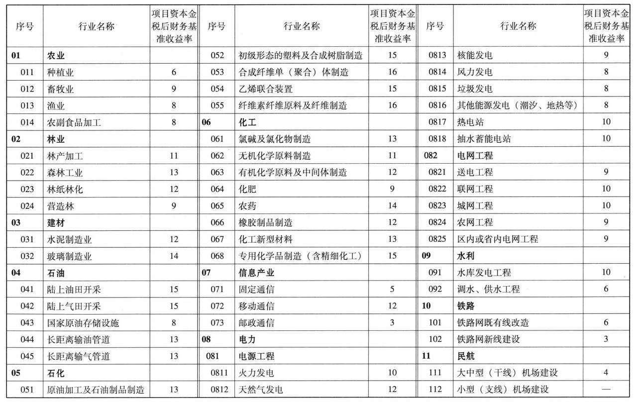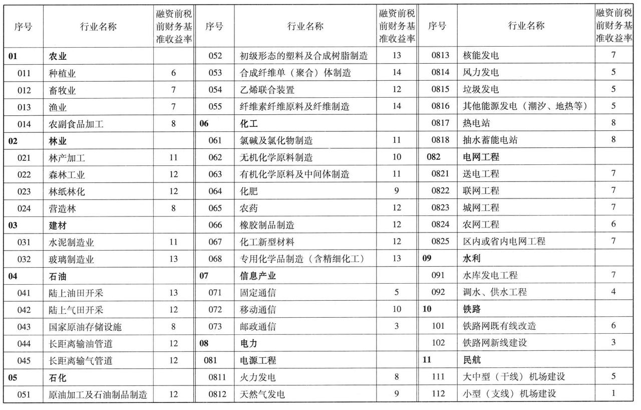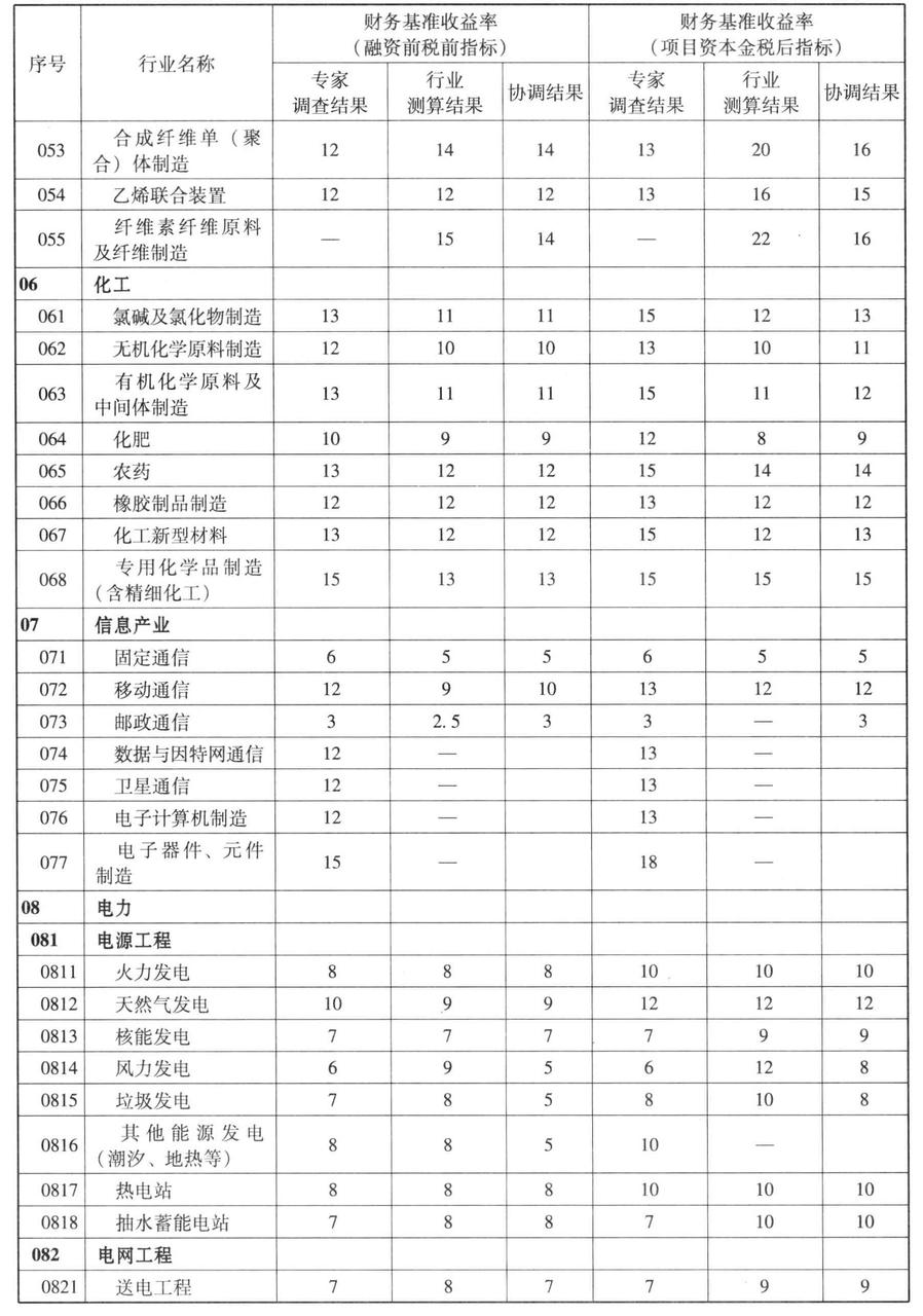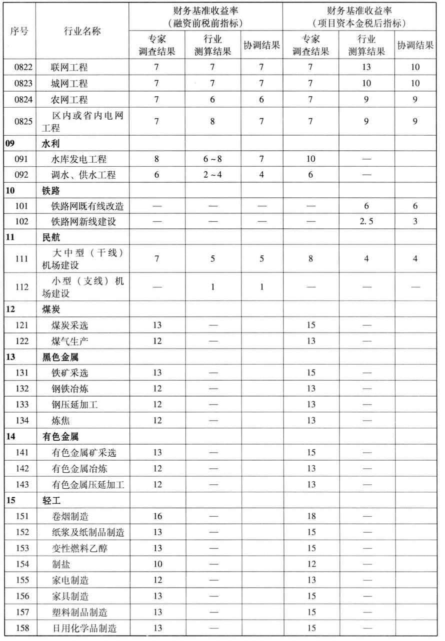 通过各种方法研究、测算并协调后,确定了若干行业财务基准收益率的取值。