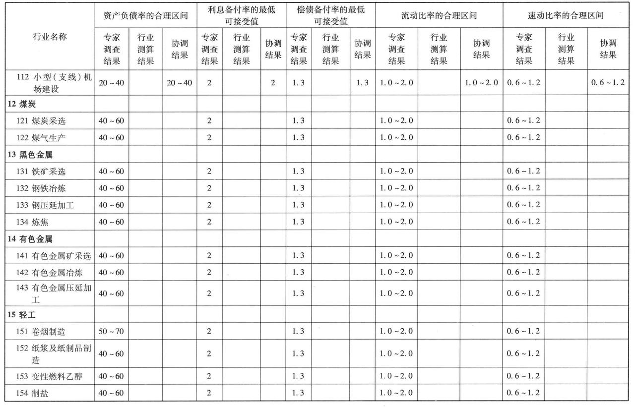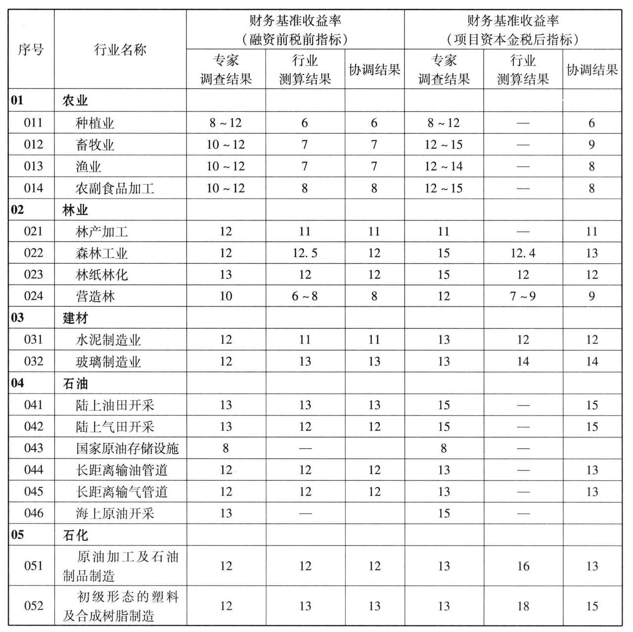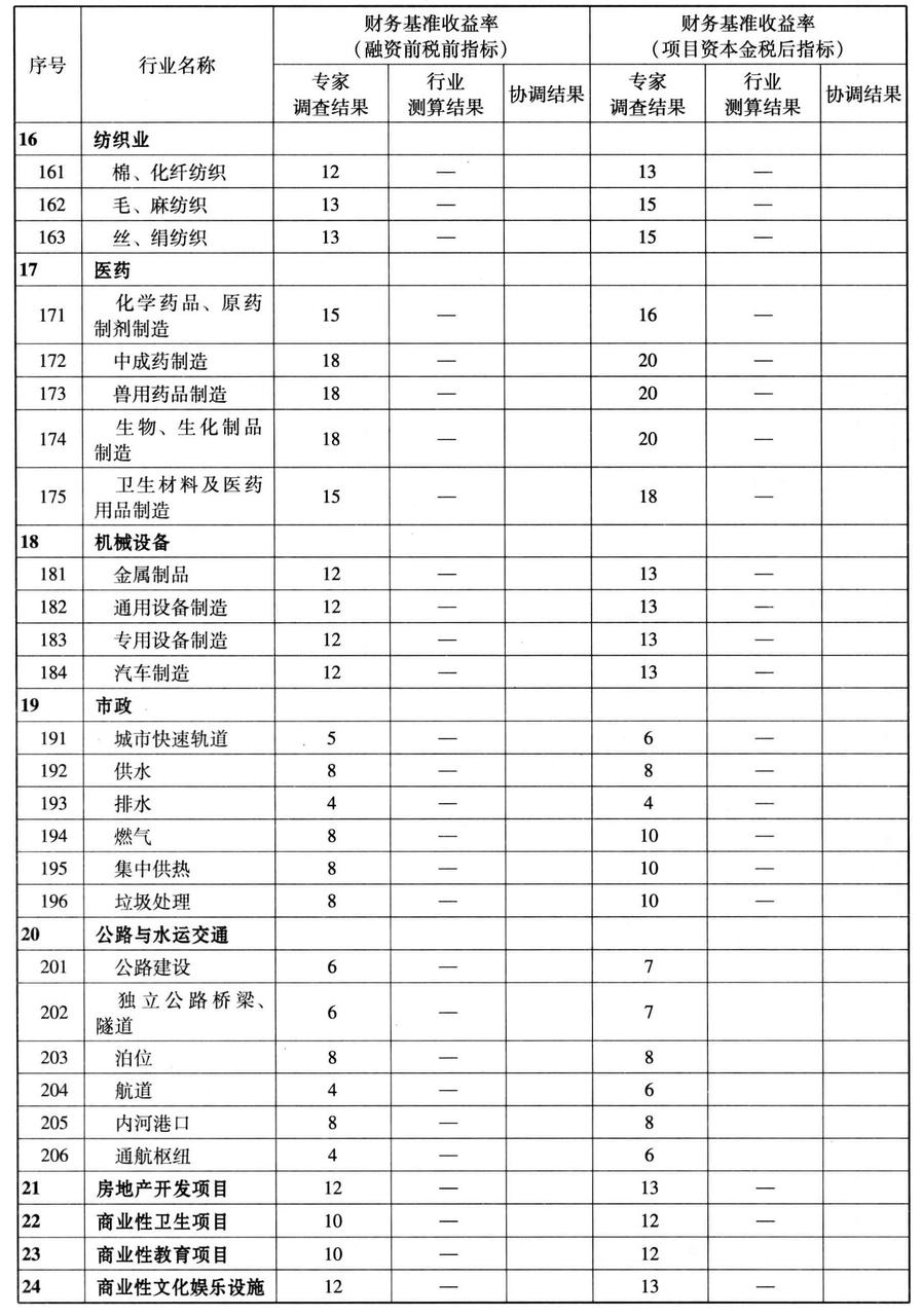 通过各种方法研究、测算并协调后,确定了若干行业财务基准收益率的取值。