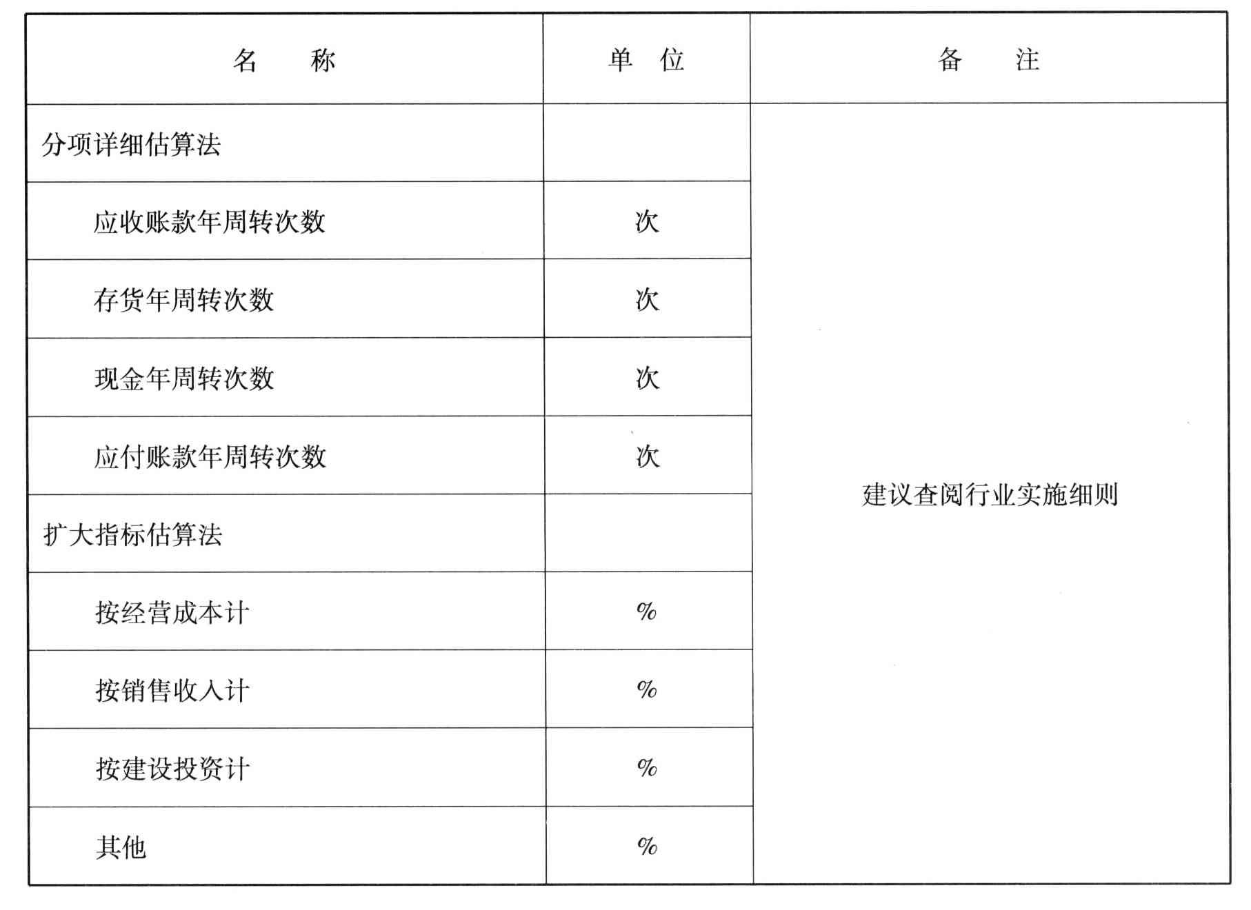 表2.1-2 流动资金估算的有关参数