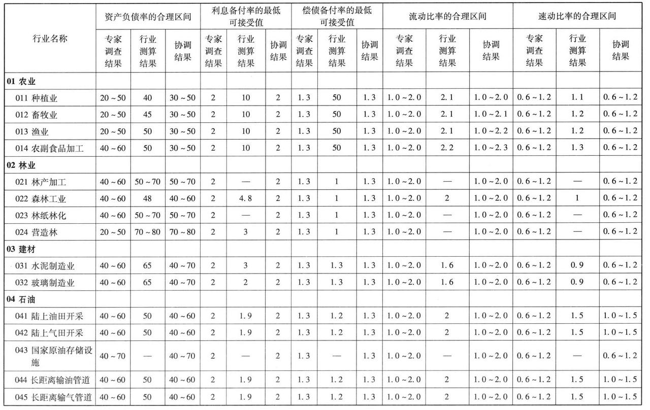 总资产报酬率、净利润率、资产负债率、流动比率、速动比率等参数,应测定其取值的合理区间。具体测定可采取下列方法: