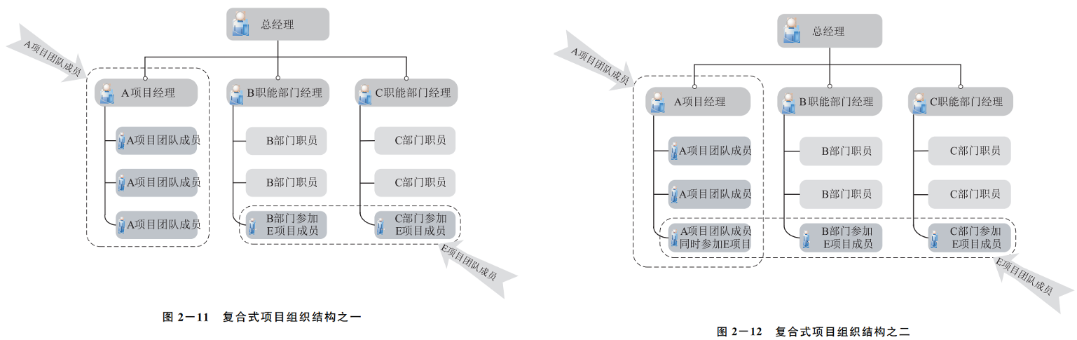 公司的组织结构形式并不都是以职能式、项目式或矩阵式的单一形式存在,在复杂的市场环境中,通常采用多种形式的混合形式,即复合式组织结构形式。